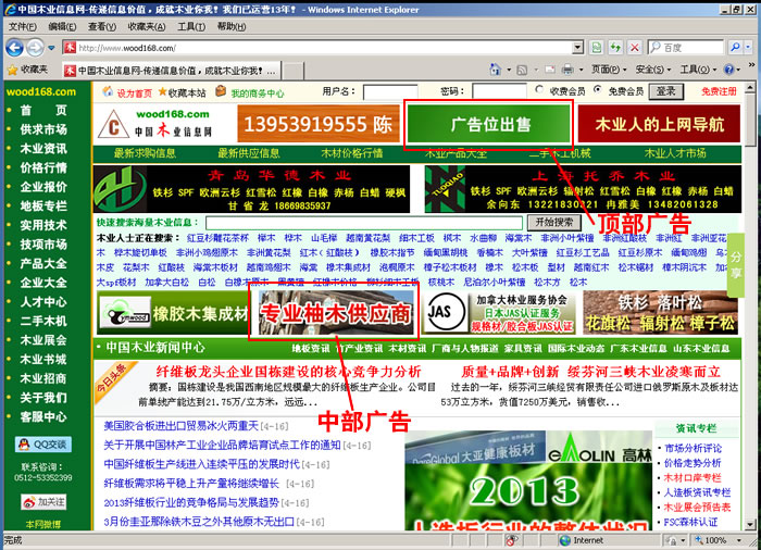 中国木业信息网首页各种类型广告尺寸及位置示范