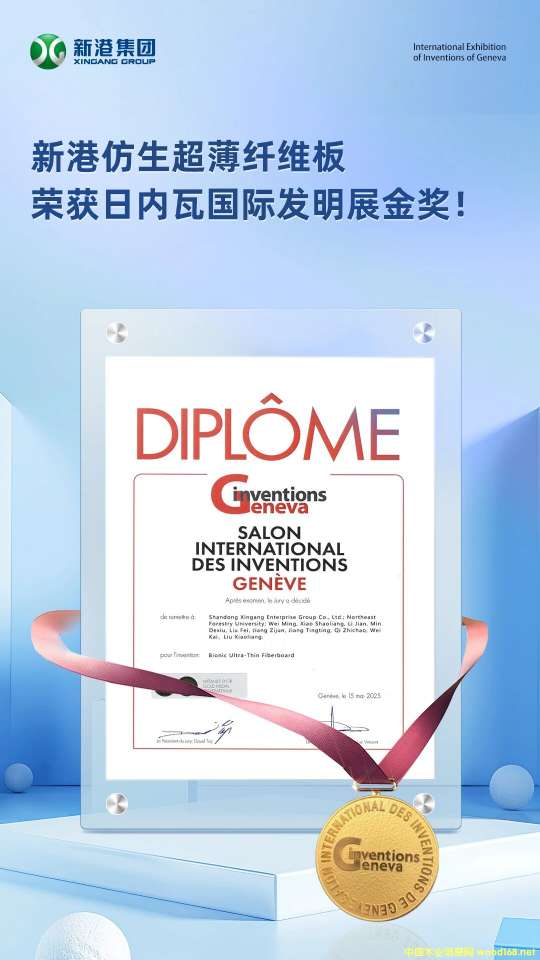 由山东新港企业集团与东北林业大学联合研发的“仿生超薄纤维板”(Bionic Ultra-Thin Fiberboard),经过与全球40多个国家及地区的1000多参展项目的激烈角逐,最终斩获日内瓦国际发明展金奖。新港集团成为国内外林业行业首个获此殊荣的企业。